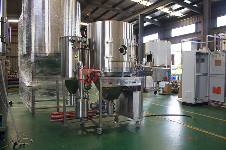 該機組核心裝置為造粒霧化器。藉此將液體霧化成微米級霧滴后被熱風迅速干燥,干燥后的顆粒經過底部收料瓶回收,粉末經過旋風分離器回收。設計進風溫度最高為250℃,出風溫度為145℃左右。